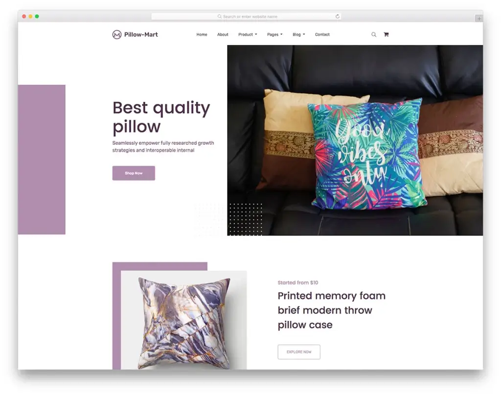 Pillow Mart — бесплатный шаблон для магазинов, которые продают всё для сна: от подушек до матрасов. Спокойный дизайн, ничего лишнего — удобно смотреть, легко настроить.